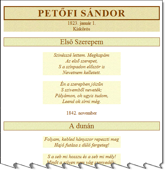 A válogatást böngészőprogrammal jelenítjük meg. Az esztétikus megjelenítéshez készítsünk CSS stíluslapot. A formázást úgy alakítsuk ki, hogy a dokumentum tartalmi egységei jól elkülönüljenek egymástól. A képen látható mintát segítségnek szánjuk, de nem cél annak lemásolása.