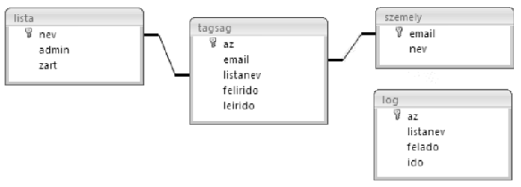 Az alábbi adatbázis egy listaszerver által kezelt listákat, azok forgalmát és tagságát tartalmazza. (Az adatbázis által tárolt adatok kitaláltak.)