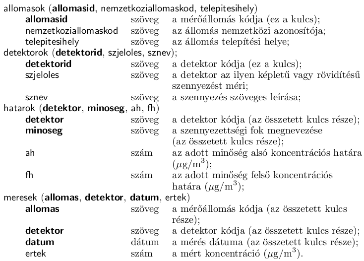 [1.] Hozzunk létre i296 néven egy üres adatbázist. Importáljuk az adatbázisba az allomasok, detektorok, hatarok és meresek táblákba az ezekkel az elnevezésekkel azonos nevű - honlapunkról letölthető - txt fájlokból az adatokat. (A fájlok UTF-8 kódolású, tabulátorral tagoltak, első sorukban a mezőazonosítók találhatók.) A táblák kapcsolatát az ábra mutatja. A meresek tábla ertek mezője üres azoknál a méréseknél, ahol az adott detektor az adott napon nem szolgáltatott adatot.