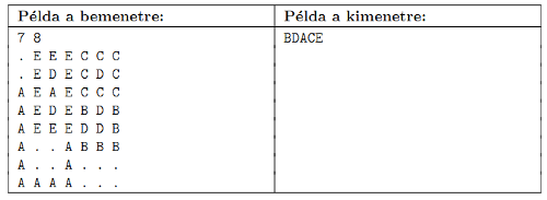A program olvassa be a standard input első sorából \(\displaystyle N\)-et, \(\displaystyle M\)-et, majd a következő \(\displaystyle M\) sorból soronként \(\displaystyle N\) darab, szóközzel elválasztott karaktert: a területen kialakuló betűrendszert. A program írja a standard outputra a téglalapok lerakásának egy lehetséges sorrendjét.
