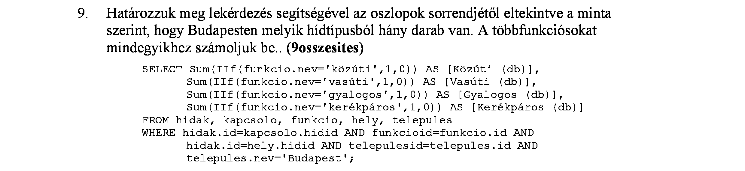 9. Határozzuk meg lekérdezés segítségével az oszlopok sorrendjétől eltekintve a minta szerint, hogy Budapesten melyik hídtípusból hány darab van. A többfunkciósokat mindegyikhez számoljuk be. (9osszesites)