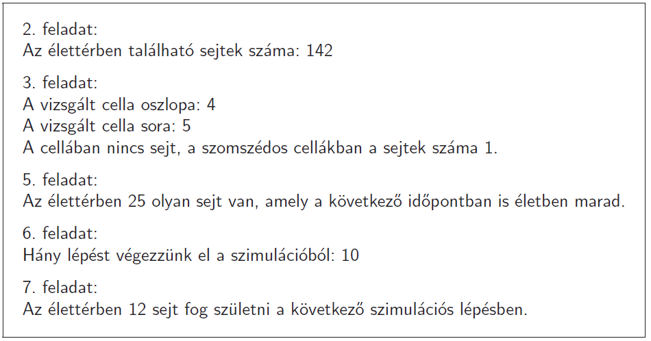 Készítsünk programot sejtautomata néven egy \(\displaystyle 50\times 50\)-es négyzethálós életjátékhoz és oldjuk meg a következő feladatokat. A megoldások során a mintához hasonlóan valósítsuk meg a felhasználóval történő kommunikációt (az ékezetmentes kiírás is elfogadott).