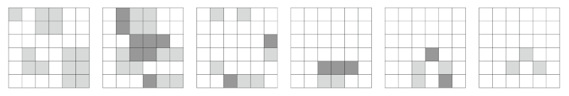 Például egy \(\displaystyle 6\times 6\)-os élettér hat egymást követő állapota (a szürke cellákban vannak sejtek, a sötétebbek új sejtek helyét mutatják):