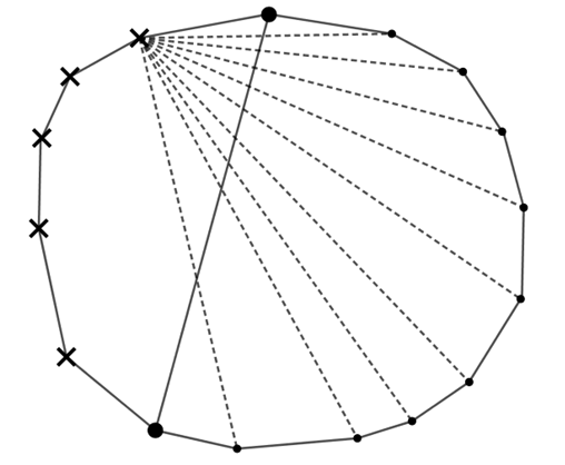 Az egyes átlókon a metszéspontok maximális számát megkapjuk, ha az elválasztott csúcsok számát összeszorozzuk. Az ábrán a jelölt csúcsból induló egyik átlón keletkezik \(\displaystyle 5\)–\(\displaystyle 9\) metszéspont.
