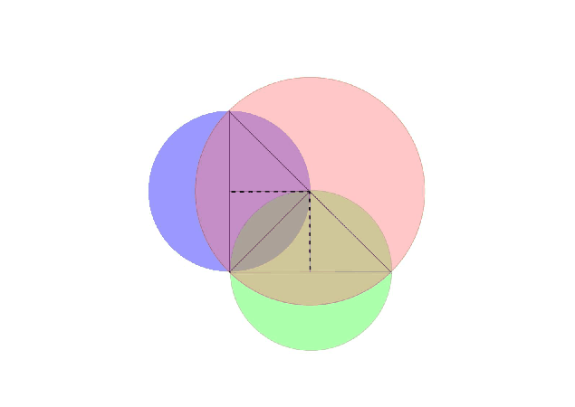 K/C. 797. Egy 10 cm befogójú, egyenlő szárú derékszögű háromszög befogói és átfogói mint átmérők fölé rajzolunk egy-egy kört. Az egyik körlapot kiszínezzük pirosra, a másikat kékre, a harmadikat zöldre. Mennyi a területe a legalább két színnel színezett síkrésznek?