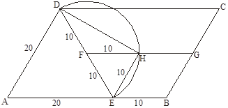 K/C. 898. Az \(\displaystyle ABCD\) paralelogramma \(\displaystyle A\)-nál lévő szöge \(\displaystyle 60\) fokos, \(\displaystyle AD=20\) cm, \(\displaystyle AB=30\) cm. Az \(\displaystyle AB\) szakasz \(\displaystyle B\)-hez közelebbi harmadolópontja \(\displaystyle E\). Az \(\displaystyle ED\) és \(\displaystyle BC\) szakaszok felezőpontja rendre \(\displaystyle F\) és \(\displaystyle G\). A \(\displaystyle DE\) szakasz mint átmérő fölé írt kör az \(\displaystyle FG\)-t \(\displaystyle H\)-ban metszi. Határozzuk meg a \(\displaystyle DH\) szakasz hosszát.