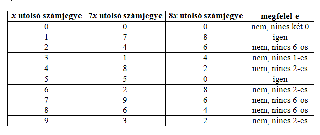 Megoldás. \(\displaystyle 12/96=1/8\), azaz a \(\displaystyle 7/8\) bővített alakját keressük. Legyen a keresett bővítés \(\displaystyle 7x/8x\). A bővített alak számlálója és nevezője összesen 6 számjegyet tartalmaz. Mivel a \(\displaystyle 7/8\) \(\displaystyle 1\)-nél kisebb, ezért a bővített tört kétjegyű/négyjegyű vagy háromjegyű/háromjegyű alakú lehet. Mivel a \(\displaystyle 99/1000\) a legnagyobb olyan szám, ami kétjegyű/négyjegyű alakú és \(\displaystyle 7/8 > 99/1000\), így a számlálóban és a nevezőben is háromjegyű számnak kell állnia. Ha \(\displaystyle 7x\) és \(\displaystyle 8x\) háromjegyű, akkor \(\displaystyle 14 < x < 125\). A számjegyek, amiket fel kell még használnunk: 0, 3, 4, 5, 7, 8. Ezért a számláló (ami kisebb, mint a nevező), nagyobb, mint 300, a nevező pedig kisebb, mint 900. Tehát (mivel a 38, 39, 40, 41 és 42 nem megoldások) \(\displaystyle 42 < x < 113\). Foglaljuk táblázatba \(\displaystyle x\), és ennek megfelelően \(\displaystyle 7x\) és \(\displaystyle 8x\) lehetséges utolsó számjegyeit.