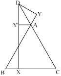 Megoldás. Legyen az ábra szerint \(\displaystyle X\) és \(\displaystyle Y\) rendre a \(\displaystyle D\)-ből \(\displaystyle BC\)-re és \(\displaystyle BA\)-ra állított merőlegesek talppontja. Tükrözzük az \(\displaystyle Y\) pontot az \(\displaystyle AC\) egyenesre. A tükörkép rákerül a \(\displaystyle DX\) szakaszra, és így az ábráról leolvasható, hogy az \(\displaystyle ABC\) háromszög magassága éppen \(\displaystyle DX\) és \(\displaystyle DY\) különbsége, azaz 6 cm. A háromszög oldala így \(\displaystyle 6\cdot\frac{2}{\sqrt3}\), területe \(\displaystyle \frac{36}{\sqrt3}=12\sqrt3\) egység.
