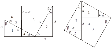 Megoldás. Az ábrán jelöljük meg 1, 2, 3, 4 és 5 számokkal a keletkező darabokat. Az 1-es és 4-es darab együtt, valamint az 5-ös egy \(\displaystyle a\), \(\displaystyle b\), \(\displaystyle c\) oldalú derékszögű háromszög. Emiatt az ábrán jelzett \(\displaystyle \alpha\) és \(\displaystyle \beta\) szögek összege \(\displaystyle 90^{\circ}\). A 2-es és 3-as darabot a helyükön hagyjuk. Az 5-öst balra fel csúsztatjuk, ez pont illeszkedik a 2-es tetejére, mert így az \(\displaystyle a\) hosszúságú oldalaik találkoznak. Az 1-est és 4-est együtt jobbra fel csúsztatjuk, akkor ezek pont illeszkednek a 3-as darab \(\displaystyle b\) hosszúságú felső oldalára. Tekintve, hogy a 3-as darabnak a 2-es fölé kilógó része és az 1-es darab \(\displaystyle a\) oldala együtt éppen \(\displaystyle b\) hosszú, azért az 5-ös és az 1-es felső csúcsa pont találkozik egymással. A létrejövő alakzat négyzet, mert minden oldala c hosszúságú, és szögei derékszögek az ábráról leolvasható módon.