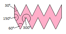 K. 439. Az ábrán látható alakzat minden oldala 10 cm hosszú, minden belső szöge \(\displaystyle 30^\circ\), \(\displaystyle 60^\circ\), \(\displaystyle 150^\circ\), vagy \(\displaystyle 300^\circ\). Mekkora a területe?