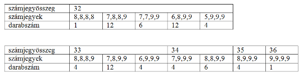 Megoldás. Komplementer módszerrel dolgozunk. Vonjuk ki az összes szám darabszámából azokét, amelyekben a számjegyek összege 32, 33, 34, 35 vagy 36. (Ezek mind csak négyjegyű számok lehetnek.)
