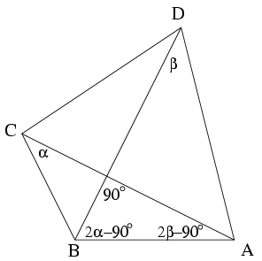 K. 50. Az ABCD négyszögben AB=AC=DB, továbbá az átlók merőlegesek egymásra. Határozzuk meg az ACB szög és az ADB szög összegét.