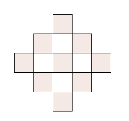 Megoldás. Számoljunk rétegenként: a tizedik építményben 1-es, 2-es, 3-as, ..., 10-es rétegek vannak, bennük rendre 1, \(\displaystyle 4 + 1 = 5\) és \(\displaystyle 9 + 4 = 13\),..., \(\displaystyle 10^2 + 9^2\) kis kockával, ugyanis az egyes rétegekben sakktáblaszerű színezést alkalmazva kiderül, hogy az \(\displaystyle n\). szinten \(\displaystyle n^2+(n-1)^2\) darab kocka van.