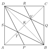 K. 557. Egy \(\displaystyle ABCD\) négyzet \(\displaystyle P\), \(\displaystyle Q\), \(\displaystyle R\) és \(\displaystyle S\) oldalfelező pontjait összekötöttük a négyzet csúcsaival az ábrán látható módon. Bizonyítsuk be, hogy \(\displaystyle AT = TV\).