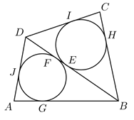 K. 566. Az \(\displaystyle ABCD\) négyszög oldalai \(\displaystyle AB = 8\) cm, \(\displaystyle BC= 7\) cm, \(\displaystyle CD = 6\) cm és \(\displaystyle DA = 5\) cm hosszúak. Az \(\displaystyle BCD\) és \(\displaystyle ABD\) háromszögek beírható köre a \(\displaystyle BD\) átlót rendre az \(\displaystyle E\) és \(\displaystyle F\) pontokban érinti. Milyen hosszú az \(\displaystyle EF\) szakasz?