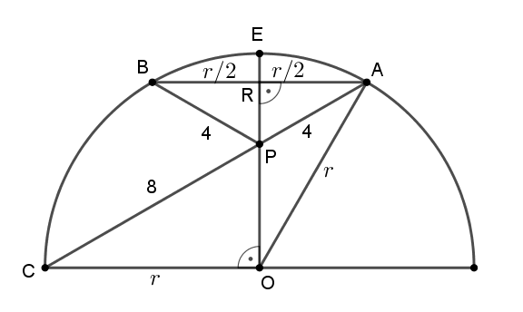 Megoldás. A belső pont az ábrának megfelelően legyen \(\displaystyle P\). Ekkor \(\displaystyle RO\) az \(\displaystyle AOB\) szabályos háromszög magassága, így \(\displaystyle RO = \frac{\sqrt3}{2} r\). A \(\displaystyle CPO\) és az \(\displaystyle APR\) derékszögű háromszögek hasonlók, mivel átfogójuk és egy-egy befogójuk aránya megegyezik, így \(\displaystyle RP:PO = 1:2\). Tehát a \(\displaystyle CPO\) háromszögben az oldalak \(\displaystyle 8\), \(\displaystyle r\) és \(\displaystyle \frac23 \cdot \frac{\sqrt3}{2} r = \frac{\sqrt3}{3} r\). Felírva a Pitagorasz-tételt: \(\displaystyle 8^2 = r^2 + \frac39 r^2\), ahonnan \(\displaystyle 64 = \frac43 r^2\), \(\displaystyle r = 4\sqrt3\).