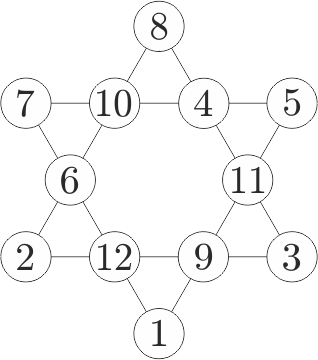 Megoldás. Ha összeadjuk az összes vonalon lévő számokat, akkor a keresett összeg \(\displaystyle 6\)-szorosát kapjuk, és minden körben lévő számot kétszer számoltunk. Tehát az egy-egy vonalon álló négy szám összege \(\displaystyle \frac{1+2+3+... +12}{3}\). A \(\displaystyle 12\) és a \(\displaystyle 9\) mellé összesen \(\displaystyle 5\) kerül, ez csak \(\displaystyle 2+3\) formában tehető meg. A \(\displaystyle 7\) és \(\displaystyle 4\) mellé összesen \(\displaystyle 15\) kerül. A \(\displaystyle 3+12\), \(\displaystyle 4+11\), \(\displaystyle 6+9\), \(\displaystyle 7+8\) összegek egyik tagja már foglalt, így csak \(\displaystyle 5+10\) kerülhet a \(\displaystyle 7\) és \(\displaystyle 4\) mellé. Ha a \(\displaystyle 10\) a külső csúcsba kerülne, akkor a csúcsokba eddig biztosan bekerülő számok összege \(\displaystyle 7+10+3+2=22\) lenne, azonban ehhez már \(\displaystyle 4\)-et csak \(\displaystyle 1+3\) formában tudnánk adni, azonban a \(\displaystyle 3\) más foglalt. Tehát az \(\displaystyle 5\) kerül a hatszög külső csúcsába. Hasonlóan a \(\displaystyle 7+12\) mellé összesen \(\displaystyle 7\)-et kell írnunk, ez már csak \(\displaystyle 6+1\) formában lehetséges. Ha a \(\displaystyle 6\) kerülne a külső csúcsba, akkor a csúcsokban álló számok összege \(\displaystyle 7+6+2+3+5=23\) lenne, amihez \(\displaystyle 3\) kéne, de ez nem lehetséges. Így az \(\displaystyle 1\) kerül a külső körbe. Tehát most itt tartunk (a \(\displaystyle 2\) és a \(\displaystyle 3\) helyzete még nem dőlt el):