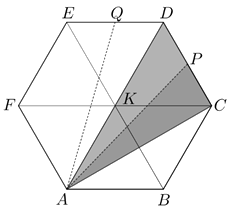 Húzzuk be az \(\displaystyle A\) csúcsból a \(\displaystyle CD\) szakasz \(\displaystyle P\) felezőpontján átmenő egyenest. \(\displaystyle T_{ABC}=t\), mert a \(\displaystyle 2t\) területű \(\displaystyle ABCK\) rombusz területének a fele. \(\displaystyle T_{ACP}= T_{ADP}\), mert \(\displaystyle DP=CP\) és a két háromszögben ezekhez az oldalakhoz ugyanaz a magasság tartozik. (A háromszög súlyvonala felezi a területét.) Így \(\displaystyle T_{ACP} = (T_{ABCD} -T_{ABC}):2 = (3t-t):2=t\), és így \(\displaystyle T_{ABCP}= T_{ABC}+ T_{ACP} =t+t=2t\), tehát az \(\displaystyle ABCP\) négyszög területe valóban a hatszög területének harmada. A másik területharmadoló egyenes pedig az \(\displaystyle AQ\) egyenes, ahol \(\displaystyle Q\) azt \(\displaystyle ED\) oldal felezőpontja.