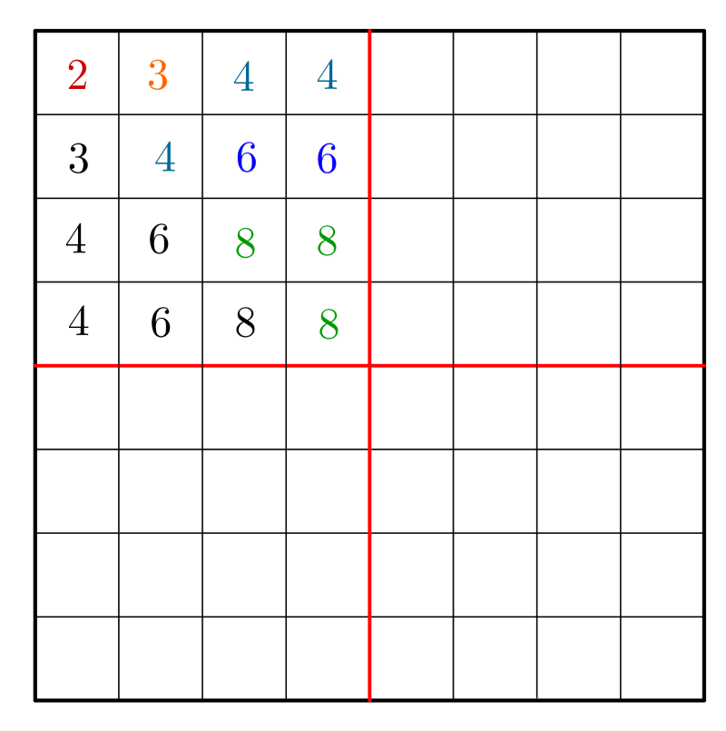 2. megoldás. Mivel két oldalfelező merőlegesére is szimmetrikus, és ezek a merőlegesek nem haladnak át a mezők belső pontjain, így elegendő egy \(\displaystyle 4\times4\)-es sarokdarabon vizsgálni az arányt. A kétféle mezők száma (,,legalább négy", illetve ,,legalább nyolc") ugyanis négyszeres lesz a teljes táblán, mint a kiválasztott \(\displaystyle 4\times4\)-es sarokdarabon, vagyis az arányuk ugyanannyi lesz.