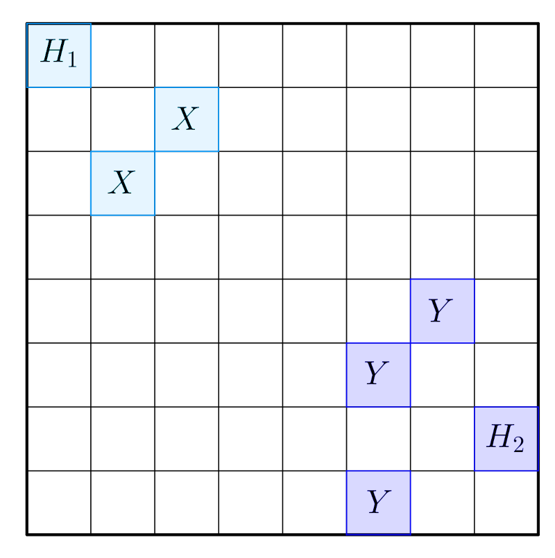 Ha a huszár a sakktábla valamelyik sarokmezőjén áll, akkor onnan egy lépésben csak kétféle mezőre léphet, ha pedig egy sarokmező mellett közvetlenül elhelyezkedő szélső mezőn van, akkor csak háromféle lépési lehetősége van. Például az alábbi ábra \(\displaystyle H_1\) jelű sarokmezőjéről indulva a huszár csak az \(\displaystyle X\)-szel jelölt mezőket foglalhatja el, a \(\displaystyle H_2\) jelű mezőről pedig az \(\displaystyle Y\)-nal jelölt három mezőt.