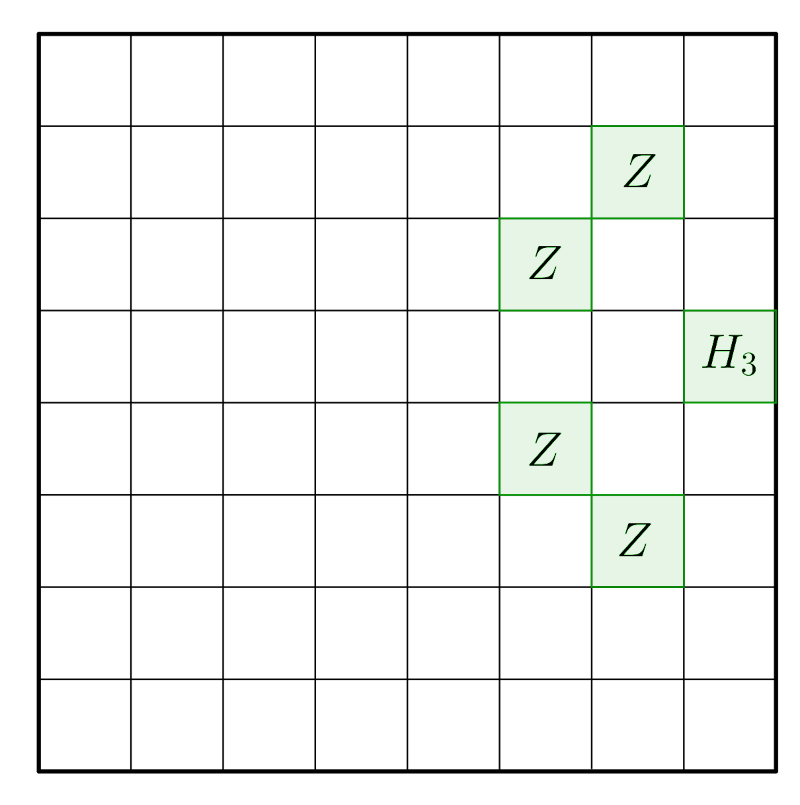 Ha a huszár a sakktábla valamelyik szélső mezőjén áll, de nem sarokmezőn, vagy azzal élben szomszédos mezőn, akkor onnan egy lépésben már négyféle mezőt választhat célpontként. Ezeket a lehetőségeket ábrázoltuk a 2. ábrán, ahol a \(\displaystyle H_3\) mezőről induló huszár a \(\displaystyle Z\)-vel jelölt mezőkre léphet.
