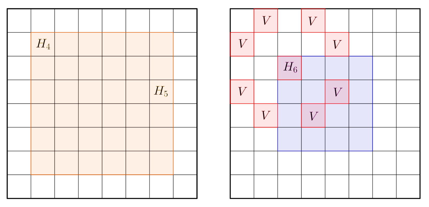 A 3. ábra jobb oldali \(\displaystyle 4\times4\)-es négyzetének \(\displaystyle H_6\) sarokmezőjén álló huszár viszont pontosan 8-féle mezőre léphet, ezeket az ábrán \(\displaystyle V\)-vel jelöltük.