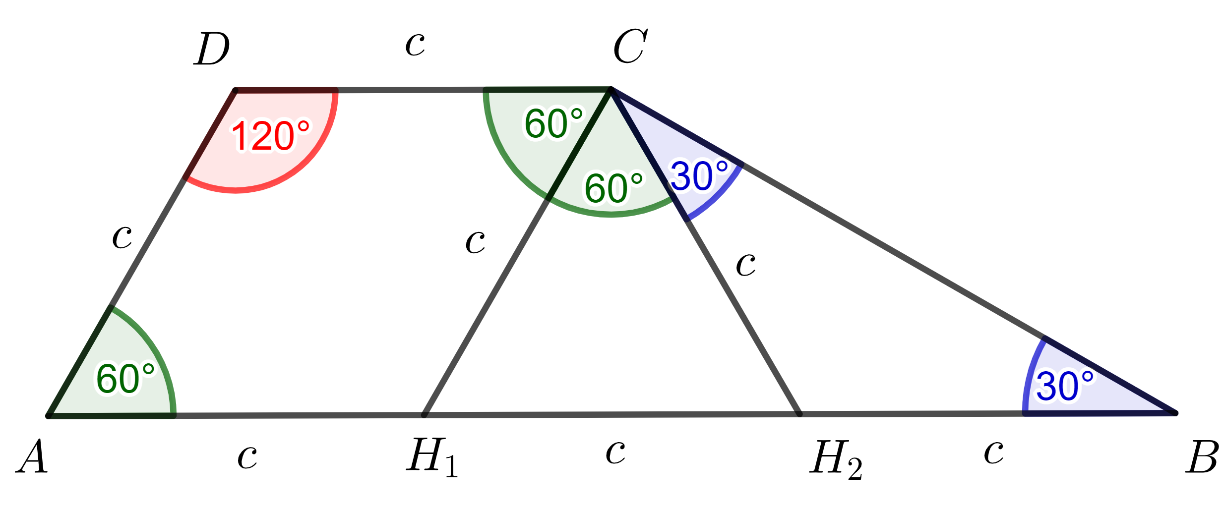 Az \(\displaystyle ABCD\) trapéz, tehát \(\displaystyle CDA \sphericalangle + DAB\sphericalangle=180^{\circ}\). Tudjuk, hogy a \(\displaystyle CDA\sphericalangle=120^{\circ}\), ezért a \(\displaystyle DAB\sphericalangle=60^{\circ}\). Jelölje \(\displaystyle H_1\) és \(\displaystyle H_2\) az \(\displaystyle AB\) oldal harmadolópontjait, továbbá jelöljük \(\displaystyle c\)-vel a \(\displaystyle CD=DA\) szakasz hosszát. Ekkor tehát \(\displaystyle CD=DA=AH_1=H_1H_2=H_2B=c\). Mivel \(\displaystyle CD=AH_1\) és \(\displaystyle DC \parallel AH_1\), az \(\displaystyle AH_1CD\) négyszög parallelogramma, hiszen két szemközti oldala párhuzamos és egyenlő. Így \(\displaystyle DCH_1\sphericalangle=60^{\circ}\), továbbá \(\displaystyle AH_1C\sphericalangle=120^{\circ}\), valamint \(\displaystyle CH_1=c\). Ekkor a \(\displaystyle CH_1H_2 \triangle\) szabályos, ugyanis egyenlő szárú, és a két szár által bezárt szöge \(\displaystyle 60^{\circ}\). Ebből következően \(\displaystyle CH_2=c\), tehát a \(\displaystyle CH_2B\triangle\) is egyenlő szárú, szárszöge pedig \(\displaystyle 120^{\circ}\). Ennek a háromszögnek tehát az alapon fekvő szögei \(\displaystyle H_2BC\sphericalangle=BCH_2\sphericalangle=30^{\circ}\). Összefoglalva tehát az \(\displaystyle ABCD\) trapéz kérdéses szögei :