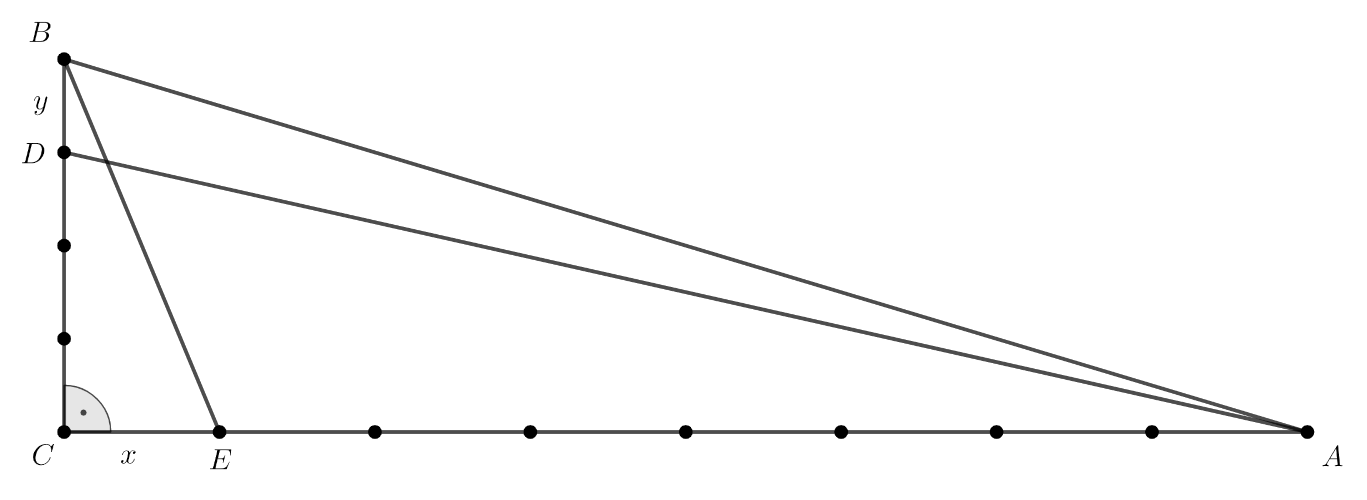Legyen \(\displaystyle CE=x\), és \(\displaystyle BD=y\). A \(\displaystyle CEB\) és a \(\displaystyle CAD\) háromszög derékszögű, így oldalaikra felírható a Pitagorasz-tétel: