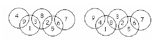 Megoldás: Az öt karika mindegyikében az összeg 13, ez összesen 65, míg az első 9 számjegy összege 45. Tehát a négy metszetben a számok összege 20 kell legyen. Ez, valamint, hogy két számból csak háromféleképpen (9+4=7+6=8+5) lehet a 13-at összerakni, lecsökkentik a lehetőségek számát. Az összes lehetőséget kipróbálva ezt a két megoldást kapjuk: