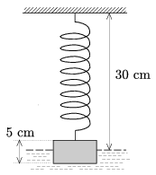 P. 4267. Egy rugó eredeti hossza 25 cm. 1 N erő hatására 2 cm-t nyúlik meg. A rugó egyik végét 30 cm magasan egy kád víz felszíne fölött rögzítjük, másik végére 5 cm magas, 32 g tömegű, 0,4 g/\(\displaystyle cm^3\) sűrűségű, fából készült téglatestet akasztunk.