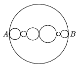 ellenállású fémhuzal felhasználásával az ábrán látható, egymást érintő karikákból álló alakzatot forrasztottuk össze. Mekkora a nagy karika AB átmérőjének végpontjai között az eredő ellenállás?