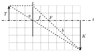 Megoldásvázlat. A méretarányosan felvett \(\displaystyle T\) tárgy- és \(\displaystyle K\) képpontot összekötő \(\displaystyle a\) fénysugár az optikai tengelyen (\(\displaystyle t\)) kijelöli az \(\displaystyle L\) lencse helyét, a \(\displaystyle b\) fénysugár pedig az \(\displaystyle F\) fókuszpontot. Végül az ábrára rajzolt négyzetrácsról leolvashatjuk, hogy a fókusztávolság \(\displaystyle f=2\) cm.