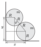 Megoldás. Jelöljük a rudak tömegét \(\displaystyle m\)-mel, sugarukat \(\displaystyle R\)-rel. (A két sugarat egyforma nagynak tekintjük, a hajszálnyi különbség csak amiatt fontos, hogy a felső rúd ne tudjon az alsón ,,átbillenni''.)