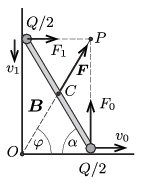 P. 4840. Egy derékszögű szögletben, függőleges síkban egy vékony, \(\displaystyle L\) hosszúságú rudat mozgatunk úgy, hogy a rúd vízszintesen mozgó alsó végének sebessége állandó, \(\displaystyle v_0\), a másik vége pedig a mozgás során nem válik el a függőleges faltól. A rúd két végén egy-egy \(\displaystyle Q/2\) töltésű kis gömb található, és az egész rendszer homogén mágneses mezőben van, amelyben a \(\displaystyle \boldsymbol B\) mágneses indukcióvektor vízszintes és az ábra síkjára merőlegesen befelé mutat.