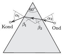 Megoldás. A feladat optikai megfelelője: Ha létezne \(\displaystyle n=\frac{v_1}{v_2}=5\) törésmutatójú anyag, hogyan juthat el a fény egy ilyen anyagból készített prizma egyik oldaláról a másikra, az Ondnak megfelelő helyről indulva a Kondnak megfelelő helyre? (Az analógia alapja a Fermat-elv, ami a fény terjedési idejének minimumával jellemzi a tényleges fénysugarak pályáját.)