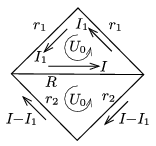 \(\displaystyle I=U_0\frac{r_1-r_2}{R(r_1+r_2)+2r_1r_2},\)