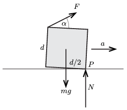 Megoldás. Legyen a jégkocka oldaléle \(\displaystyle d\) hosszú, tömege \(\displaystyle m\) és hasson a jégkockára az egyik oldaléle középpontjában \(\displaystyle F\) nagyságú, a vízszintessel \(\displaystyle \alpha\) szöget bezáró erő (lásd az ábrát).