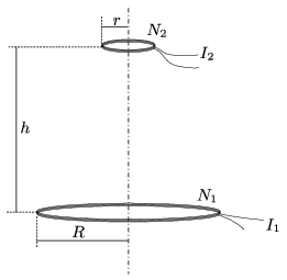 P. 4969. Két lapos tekercs közös szimmetriatengelyen, egymástól \(\displaystyle h\) távolságra az ábrán látható módon helyezkedik el. A tekercsek menetszáma \(\displaystyle N_1\), illetve \(\displaystyle N_2\), sugaruk \(\displaystyle R\) és \(\displaystyle r\) (\(\displaystyle r\ll R\)), valamint \(\displaystyle I_1\), illetve \(\displaystyle I_2\) erősségű áram folyik bennük. Mekkora erőt fejt ki egymásra a két tekercs?