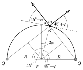 Megoldás. A gyöngy a félkörív felezőpontjában, a rögzített ponttöltésektől egyenlő távolságban lehet egyensúlyban. Térítsük ki a gyöngyöt ebből az egyensúlyi helyzetből egy kicsiny, a félkörív mentén mért \(\displaystyle s\) elmozdulással (\(\displaystyle s\ll R\)), és jelöljük a félkörív középpontjához húzott sugár szögének elfordulását \(\displaystyle 2\varphi\)-vel (\(\displaystyle \varphi\ll 1)\). Az elmozdulás és a szögelfordulás közötti kapcsolat: \(\displaystyle s=2R\varphi\).