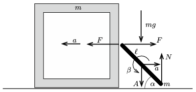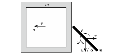 P. 5090. Vízszintes talajon egy \(\displaystyle m\) tömegű, kocka alakú doboz áll. A doboz egyik lapjának közepéhez egy ugyancsak \(\displaystyle m\) tömegű, vékony, homogén pálca támaszkodik. Kezdetben mindkét testet rögzítetten tartjuk. A pálca és a talaj által bezárt szög \(\displaystyle \alpha=45^\circ\).