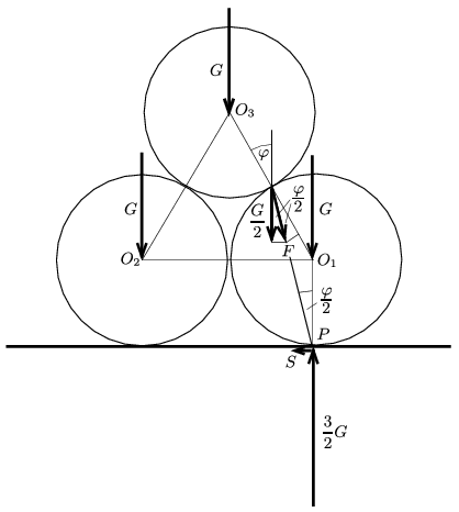 A \(\displaystyle G\) súlyú felső henger függőleges irányban \(\displaystyle G/2\) erőt fejt ki mindkét alsó hengerre, tehát az \(\displaystyle \boldsymbol F\) erő függőleges komponense \(\displaystyle G/2\). Ugyanekkora az \(\displaystyle \boldsymbol F\) erő normális komponense is, hiszen a függőlegessel és az érintőfelület normálisával bezárt szöge ugyanakkora, nevezetesen \(\displaystyle \varphi/2\). Eszerint a súrlódási erő a felső és az alsó henger között (ami \(\displaystyle \boldsymbol F\) érintő irányú komponense)