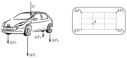 Megoldás. A gépkocsira ható erők eredője és a forgatónyomatékuk eredője a vezető beszállása előtt is és utána is nulla. Emiatt az erők megváltozásai önmagukban is erőegyensúlyt eredményeznek: