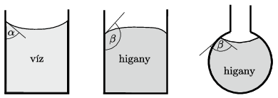 Megoldás. A víz ,,nedvesíti'' az üveget, az illeszkedési szöge hegyesszög: \(\displaystyle \alpha<90^\circ\). A higany nem nedvesíti az üveget, az illeszkedési szög tompaszög: \(\displaystyle \beta> 90^\circ\). Emiatt egy hengeres edényben a víz az üveg falánál (bal oldali ábra) felkúszik (homorúvá válik), a higany pedig lesüllyed, domború felületet alakít ki (középső ábra).