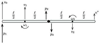 Ha a bal oldali rúd bal oldali végére egy hirtelen \(\displaystyle p_1=F\Delta t\) erőlökést fejtünk ki, a rudak haladó és forgó mozgásba jönnek, tömegközéppontjuk valamekkora \(\displaystyle v_1\) és \(\displaystyle v_2\) sebességgel kezd el mozogni (a rudakra merőleges irányban), a tömegközéppontjuk körül pedig \(\displaystyle \omega_1\) és \(\displaystyle \omega_2\) szögsebességre tesznek szert az ábrán látható irányításokkal.
