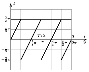 A \(\displaystyle t = 0\) pillanatban – a feladat szövege szerint – \(\displaystyle \varphi=0\), és nyilván \(\displaystyle \delta=0\). A tükrözési törvény szerint a \(\displaystyle \varphi\) szög növekedtével egy darabig \(\displaystyle \delta=2\varphi\), de ez csak addig igaz, amíg a lézersugár a hasáb oldalélére nem esik. Ez \(\displaystyle \varphi=\tfrac{1}{3}\pi=60^\circ\)-nál, \(\displaystyle t =T/6\) idő elteltével következik be. Ekkor a lézerfény hirtelen egy másik síktükörre esik, az eltérülés szöge \(\displaystyle +\tfrac43\pi\)-ről \(\displaystyle -\tfrac43\pi\)-re vált át. Ezután \(\displaystyle \varphi\) növekedtével \(\displaystyle \delta\) kétszeres ütemben növekszik, és ez egészen \(\displaystyle \varphi=\pi\)-ig tart (ekkor ér a lézerfény útjába a hasáb következő oldaléle), és ez ismétlődik a továbbiakban is. Az eltérülési szög és az elfordulás szöge, valamint az eltelt idő közötti kapcsolatot az alábbi grafikon mutatja: