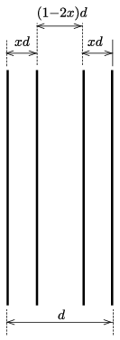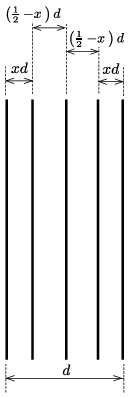 \(\displaystyle a)\) Legyen a két szélső, rögzített szál távolsága \(\displaystyle d\), egy-egy ,,belső szál'' távolsága a hozzá közelebbi rögzített száltól pedig \(\displaystyle xd\). Az elrendezés szimmetriája miatt \(\displaystyle x\) mindkét szálra ugyanakkora (1. ábra). Az egyensúlyi állapotban egy-egy belső szálra ható erők eredője nulla, vagyis fennáll: