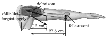 P. 5176. Egy diák vízszintesen kinyújtott karral áll. Karjának tömege 3 kg, és a kar tömegközéppontja éppen a diák könyökénél van, 27,5 cm-re a vállízületétől mint forgástengelytől az ábrán látható módon. A diák felkarjának deltaizmában ható erő \(\displaystyle 15^\circ\)-os szöget zár be a vízszintessel, és a támadáspontja 12 cm-re van a vállízülettől. Szerkesztés vagy számítás útján állapítsuk meg, hogy milyen nagy erő ébred a diák deltaizmában!
