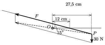\(\displaystyle F\cdot 12~{\rm cm}\cdot \sin15^\circ=3~{\rm kg}\cdot 9{,}81~\frac{{\rm m}}{\rm s^2}\cdot 27{,}5~{\rm cm},\)