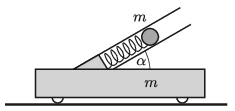 P. 5178. Vízszintes talajon lévő, \(\displaystyle m\) tömegű kiskocsira elhanyagolható tömegű, \(\displaystyle \alpha=30^\circ\)-os szögben beállított rugós puskát rögzítettünk, amely egy \(\displaystyle m\) tömegű lövedéket lő ki két esetben. Az első esetben a kocsi rögzített, a második esetben szabadon mozoghat. A lövedék függőleges irányú emelkedési magassága az első esetben \(\displaystyle h_1\), a második esetben \(\displaystyle h_2\). Határozzuk meg a \(\displaystyle h_2/h_1\) arányt!