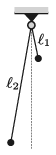 P. 5187. Egy \(\displaystyle \ell_1=25~\)cm és egy \(\displaystyle \ell_2=1{,}2\) m hosszú fonálingát azonos magasságban rögzítünk. A lengések síkja párhuzamos, és egymáshoz elég közel van. Az ingákat az egyensúlyi helyzetből azonos nagyságú, kis szöggel, ellentétes irányban kitérítjük, majd elengedjük.